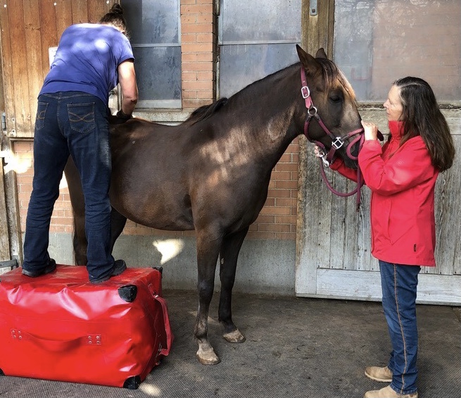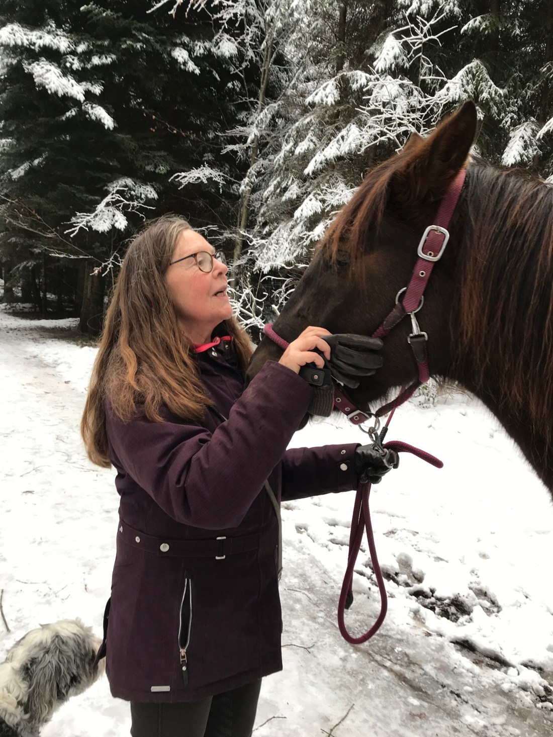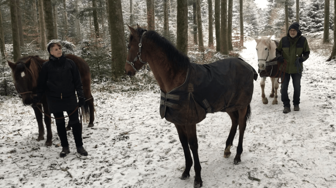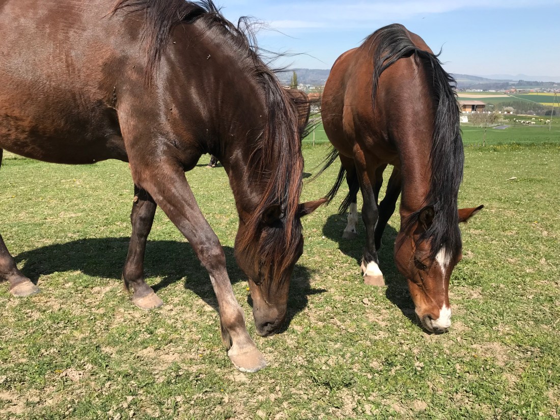 Wir stellten sie nach Ankunft zuerst in die Halle, wo wir sie nach einigen Minuten los- und alleinliessen. Sie schnupperten beide aufgeregt und versuchten, in den Bereich mit den anderen Pferden zu schauen, die ihnen zuwieherten. Ob sie ihre Kamerädli von vorher noch kannten? Sie benahmen sich jedenfalls, als wären sie immer schon zusammen in der Herde gewesen, was uns sehr beruhigte.