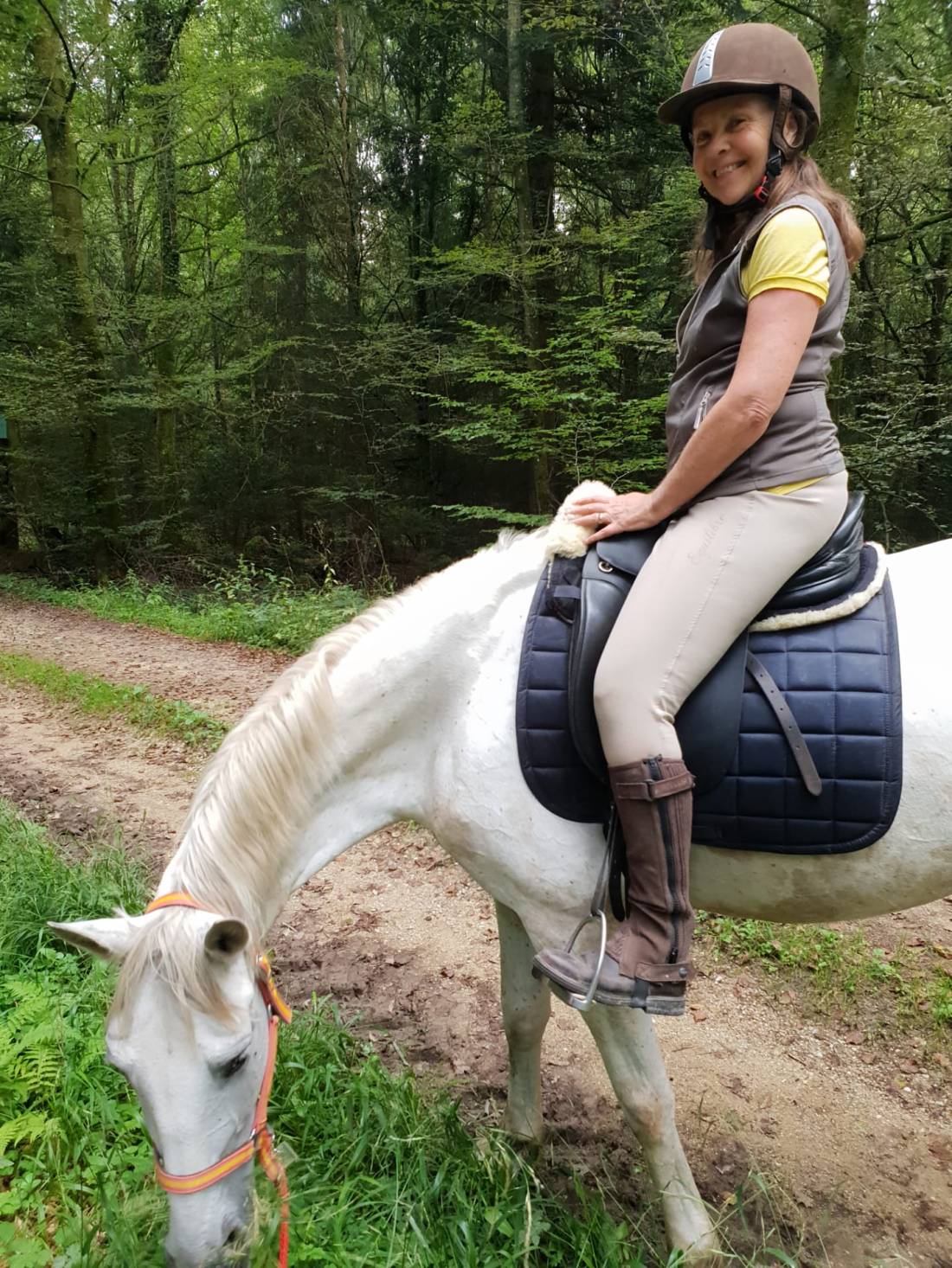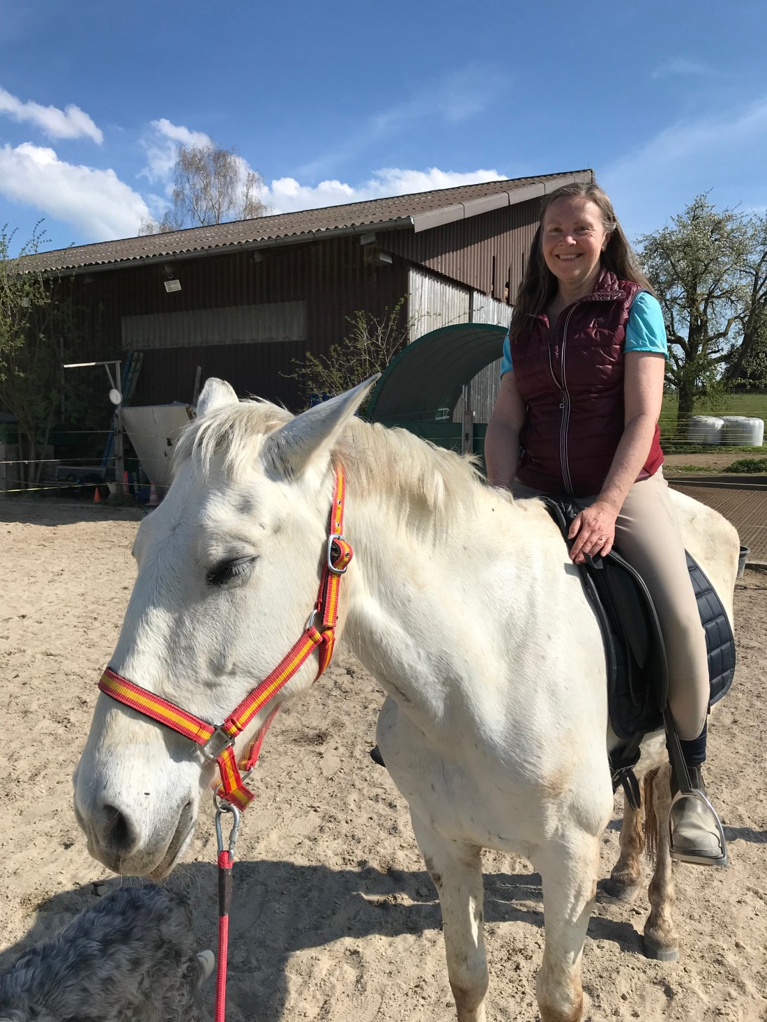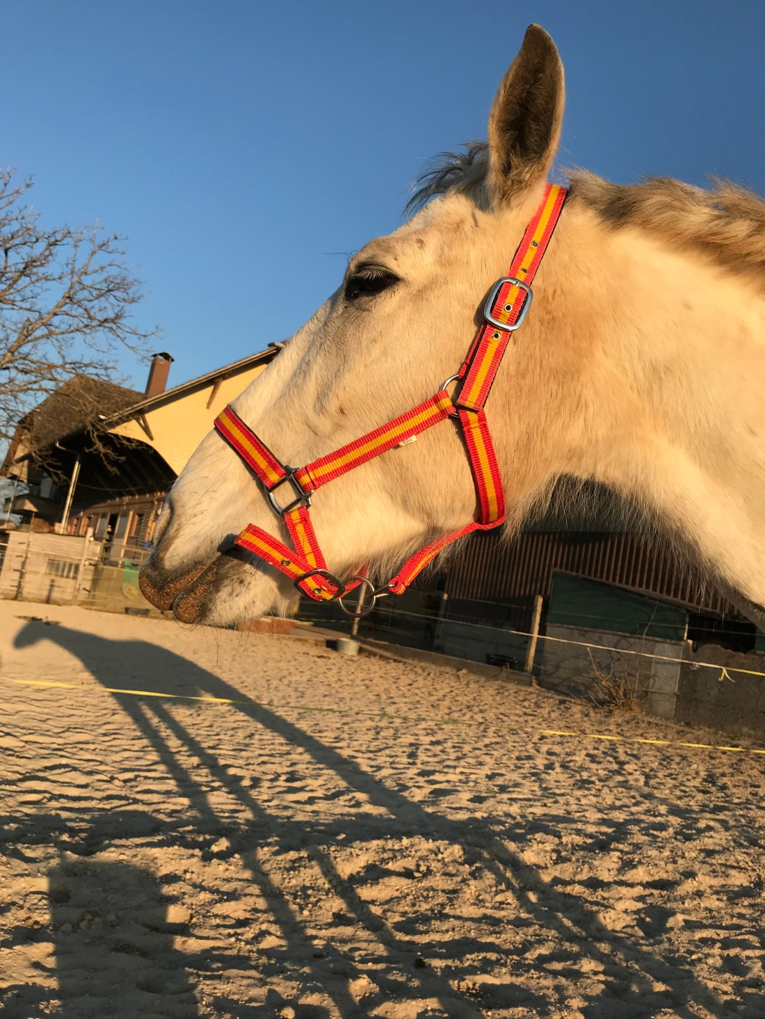 Mit dem geliehenen Sattel und Sattelgurt haben wir uns nun auf einen Waldspaziergang mit Aufsitzen aufgemacht. Eine liebenswürdige und sehr erfahrene Pferdebesitzerin hat uns mit ihrem Pferd dabei begleitet, so dass Serenata nicht ganz so aufgeregt war wie beim letzten Mal, als es mir nicht gelang, sie so weit ruhig zu stellen, dass ich aufsitzen konnte. Das lag auch daran, dass wir keine erhöhte Stelle gefunden hatten, die nicht wunderbar von Gras umgeben war und sofort Serenatas Fresstrieb weckte – und ich leider nicht vom Boden aufzusteigen in der Lage bin 🙂 (In Spanien hiess es: Wer nicht vom Boden aufsteigen kann, soll nicht reiten, ausser man hat die 60 hinter sich! So bin ich denn entschuldigt?!).
