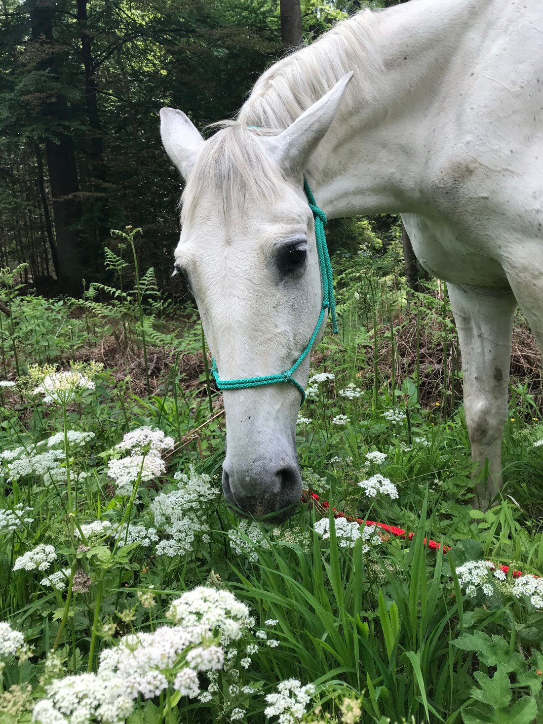 Etwas Schwierigkeiten bereitet uns der Drang zum Fressen unterwegs. Wir haben versucht, ihr das Fressen an einer bestimmten Stelle und einen bestimmten Moment zu erlauben – das Gras ist ja so was von frisch und saftig! Allerdings nützt sie das aus und lässt sich kaum noch davon trennen. Da müssen wir uns in Klarheit und Strenge üben!